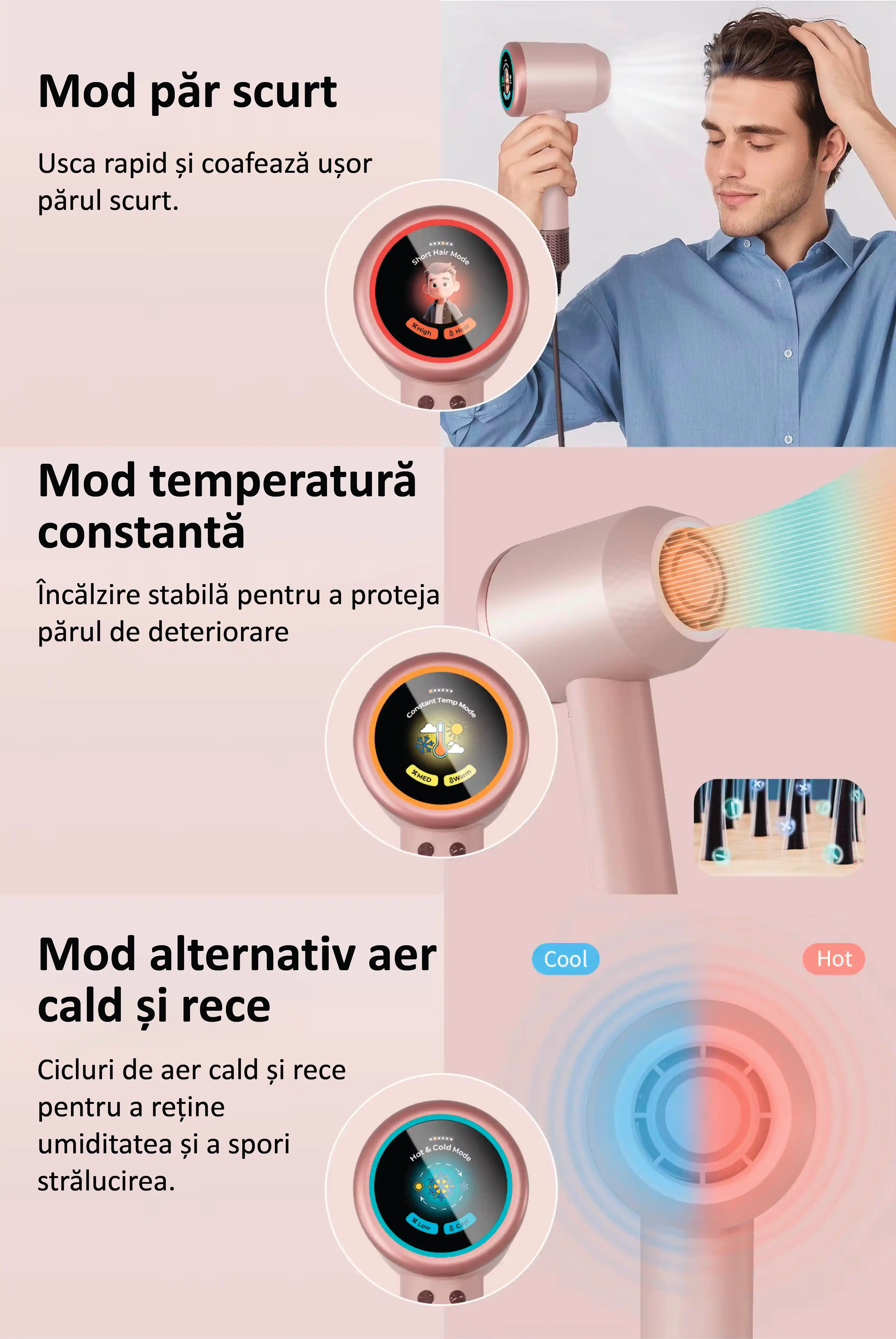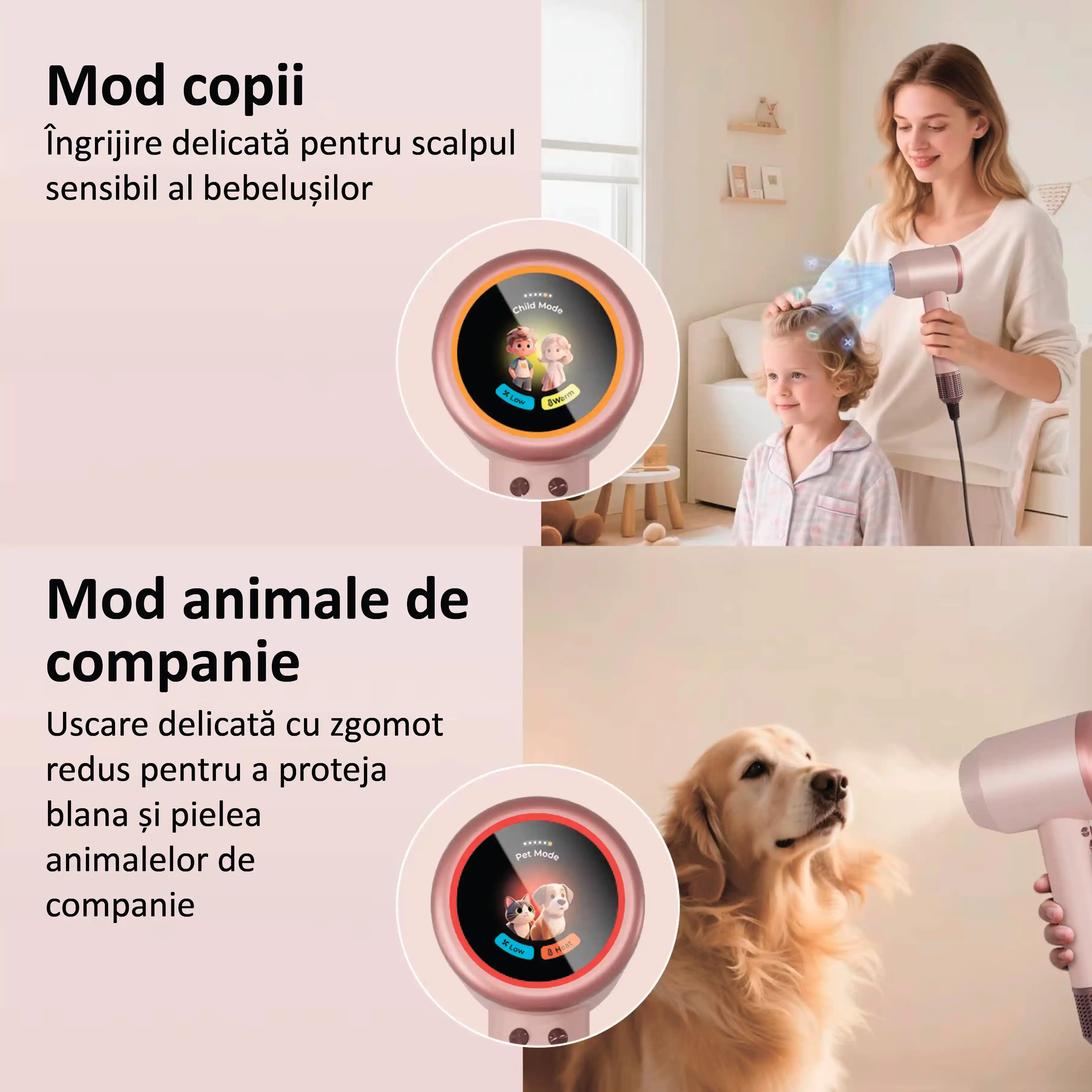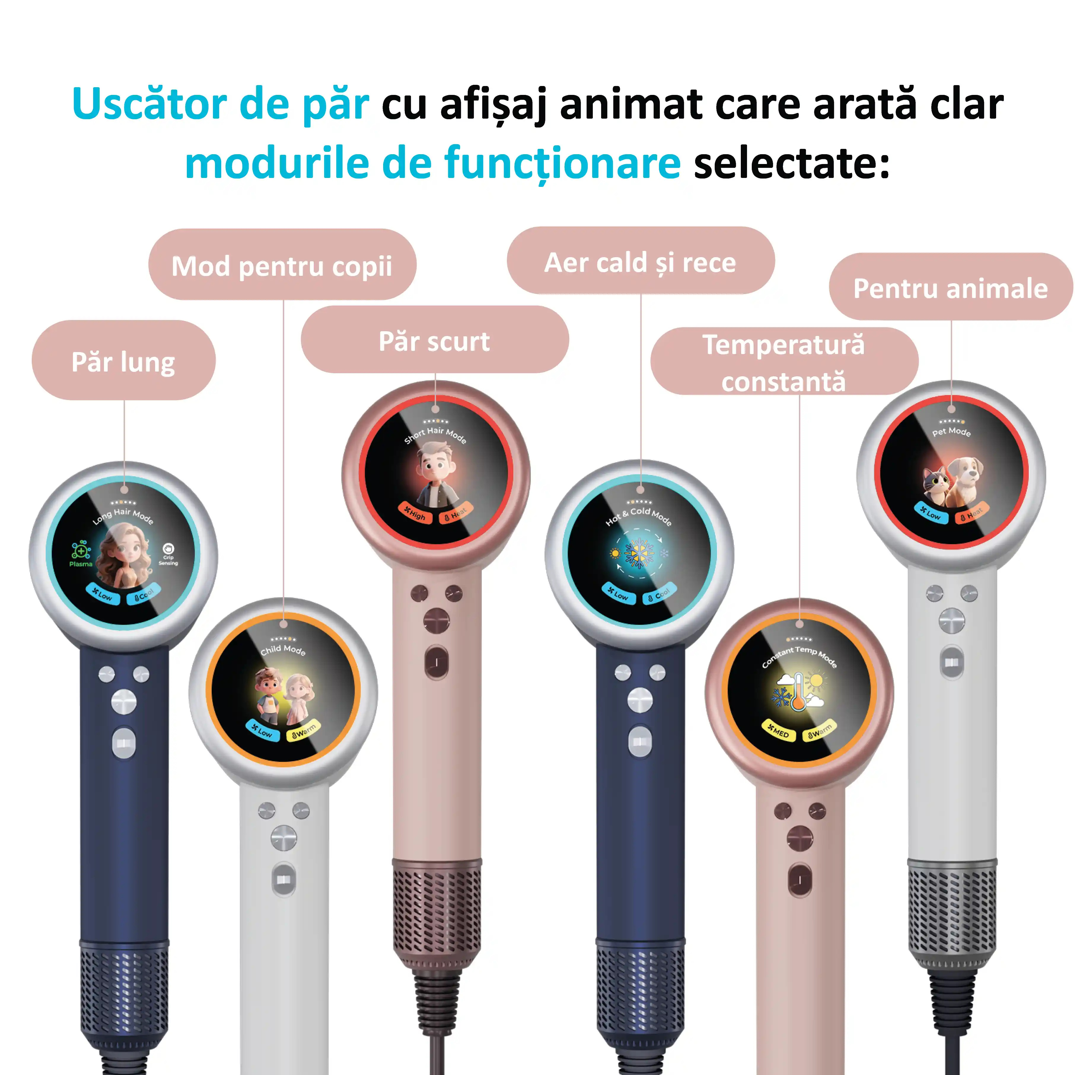 - Pentru păr lung, Pentru copii, Pentru animale de companie, Pentru păr scurt, Temperatură constantă, Alternarea aerului cald și rece