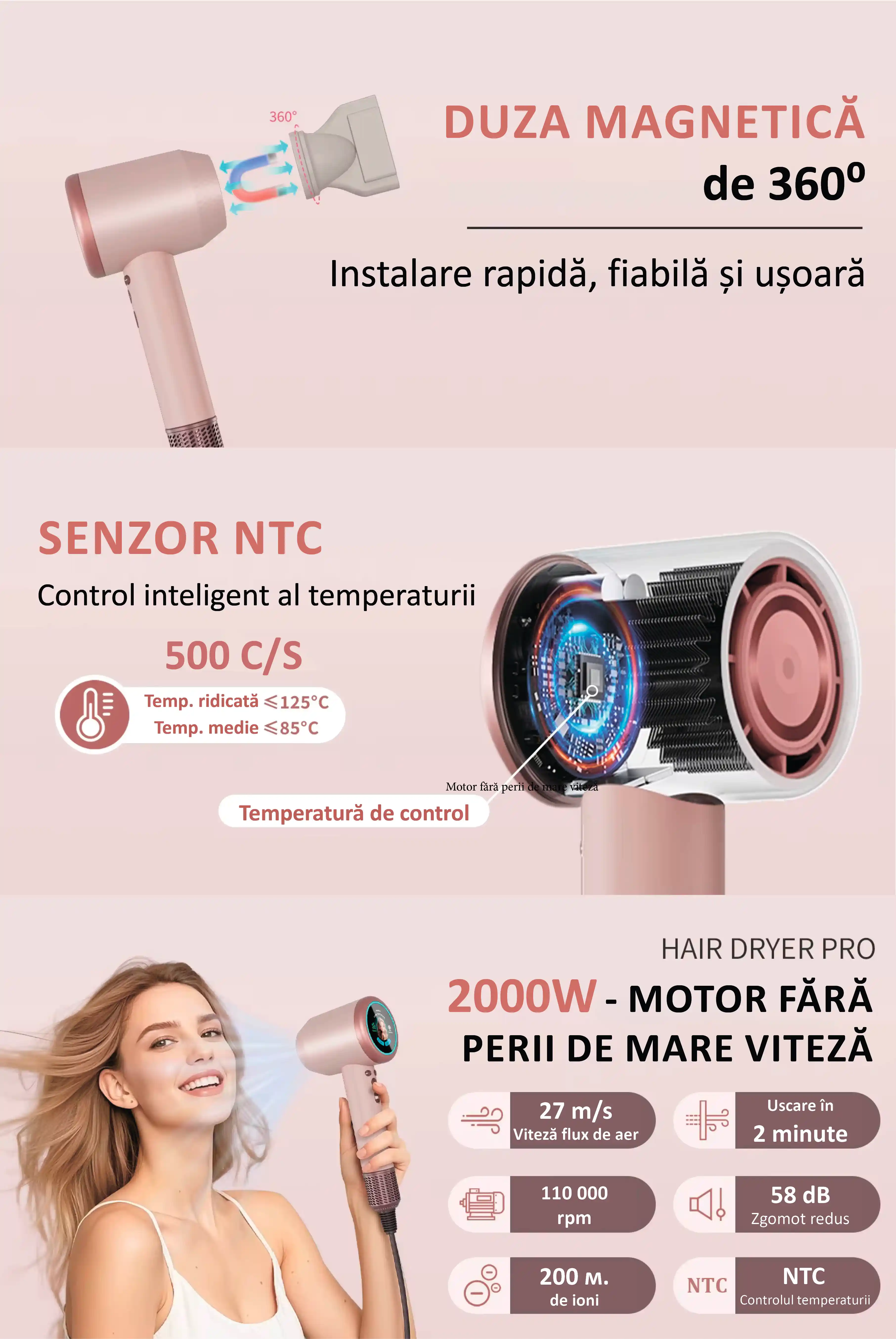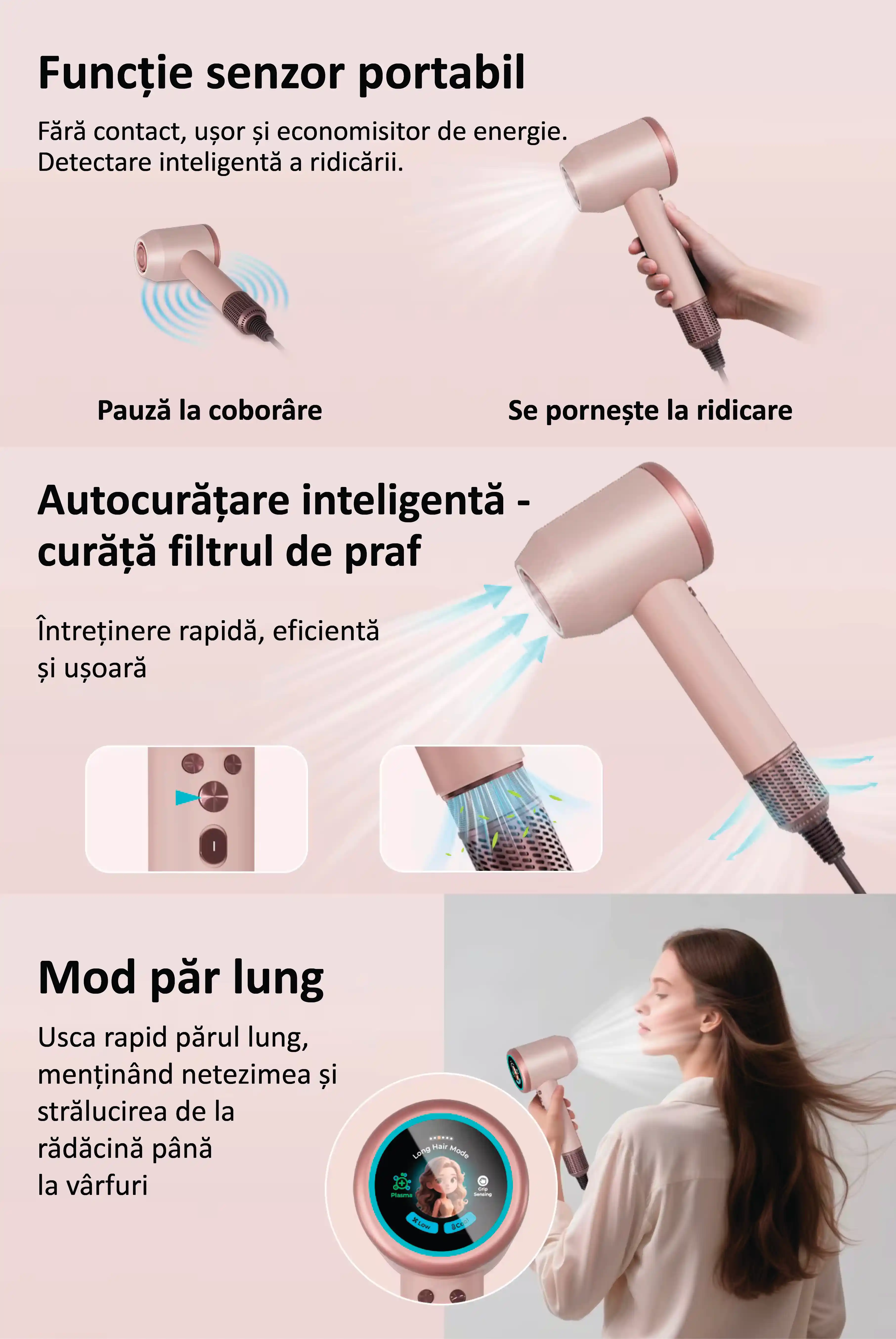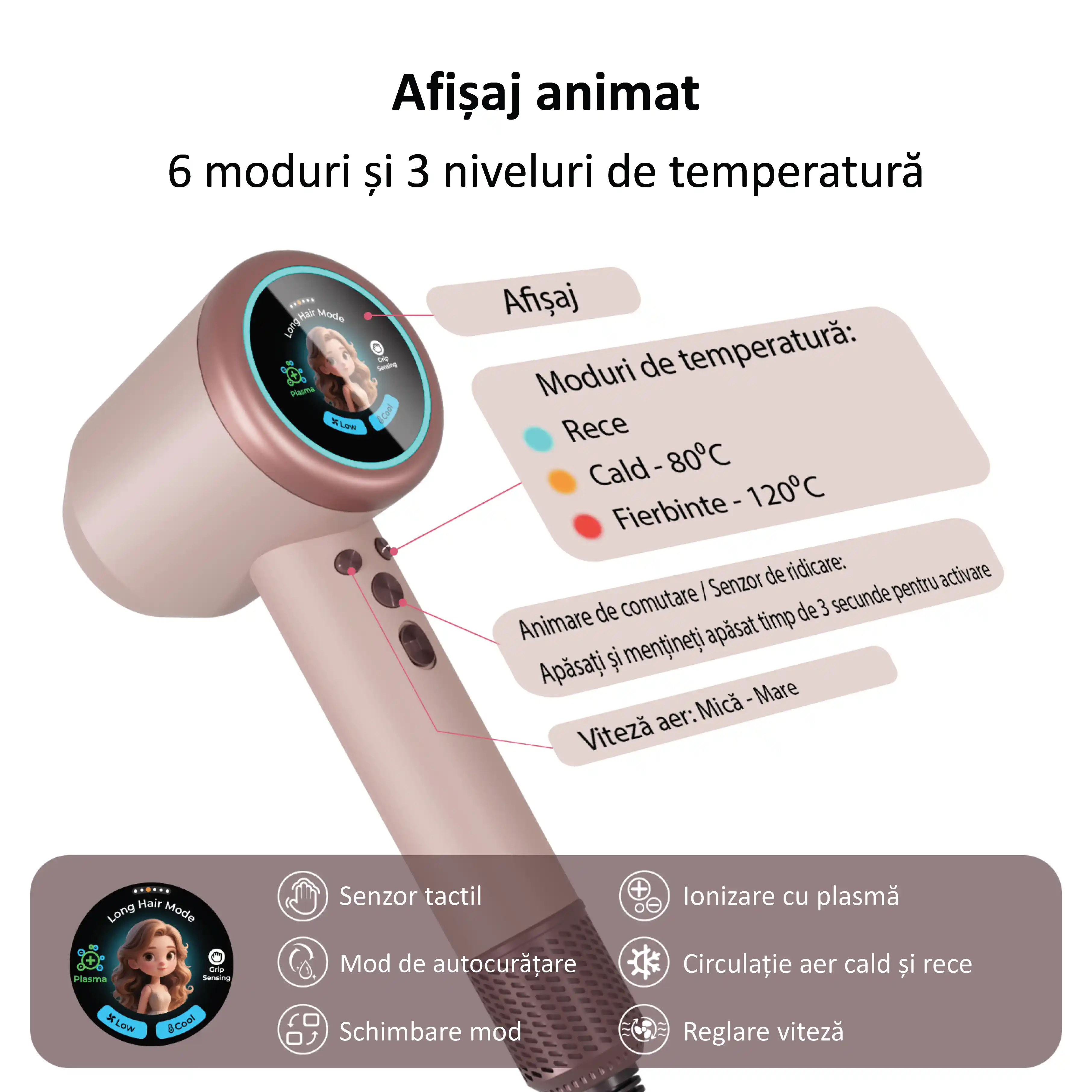 - Pentru păr lung, Pentru copii, Pentru animale de companie, Pentru păr scurt, Temperatură constantă, Alternarea aerului cald și rece