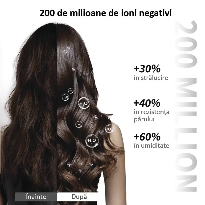 Ioni negativi - reducerea electricității statice, mai puțină electrizare, păr mai neted și mai strălucitor.